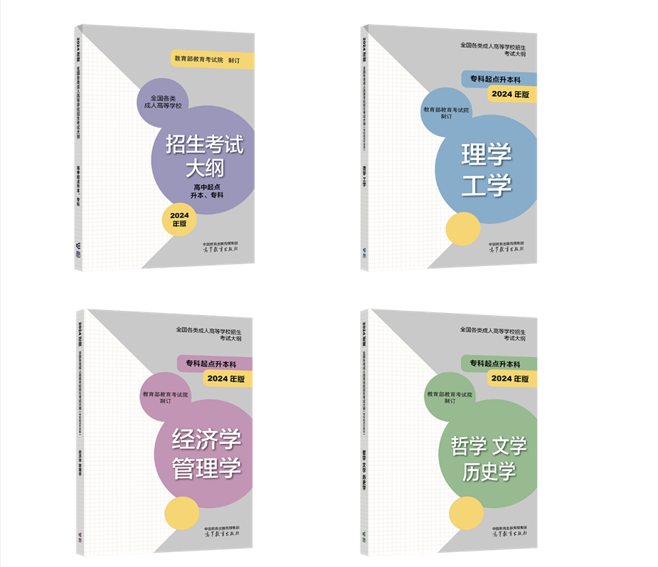 修订后的大纲为《全国各类成人高等学校招生考试大纲(2024年版)》,从2024年起启用。包括高中起点升本、专科和专科起点升本科两类,其中高中起点升本、专科大纲1册,专科起点升本科大纲按报考学科专业不同分为5册。6册大纲由高等教育出版社出版发行。